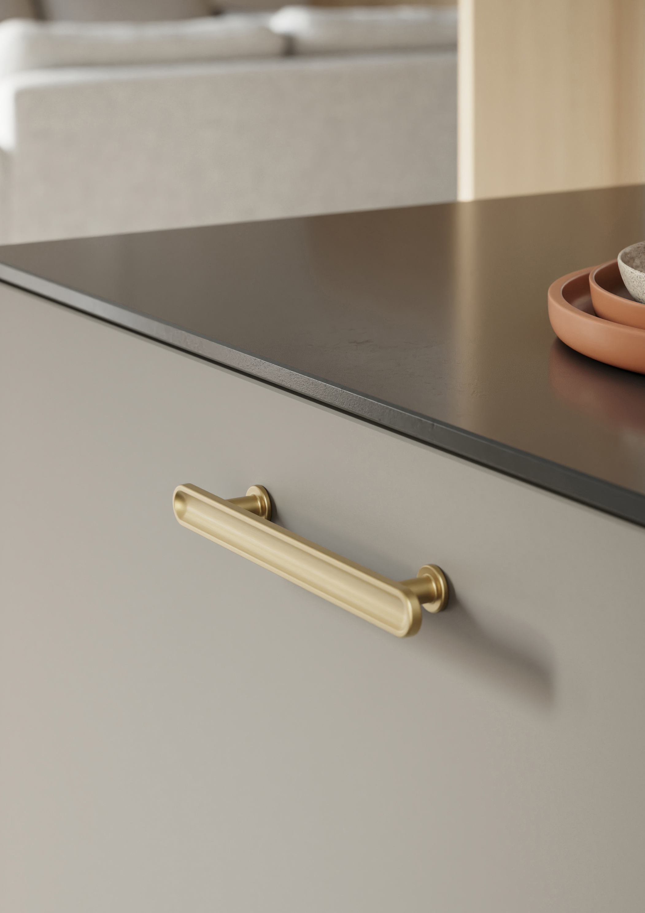 Mat messing look die warmte toevoegt aan keuken en meubel
